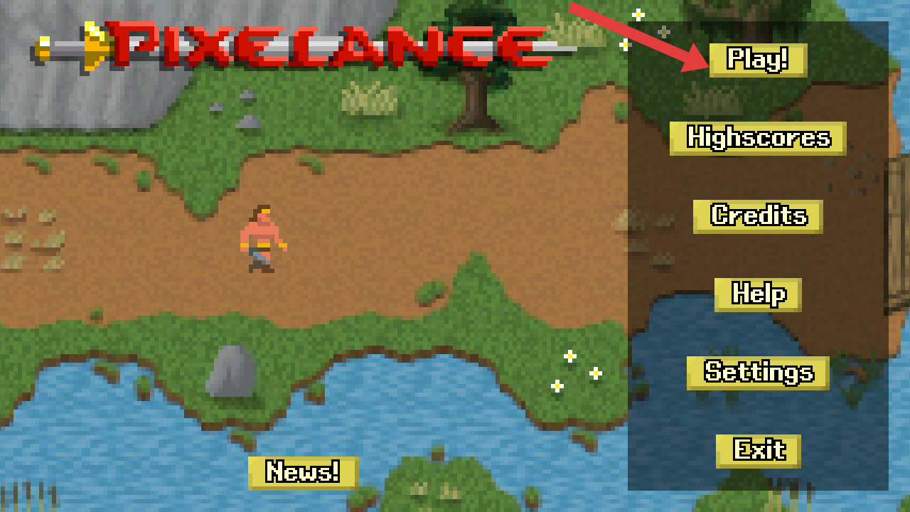 1、在像素原始人游戲的主界面,點(diǎn)擊右側(cè)【Play】按鈕,正式開啟冒險(xiǎn)者Lance Pixelot的冒險(xiǎn)之旅。
