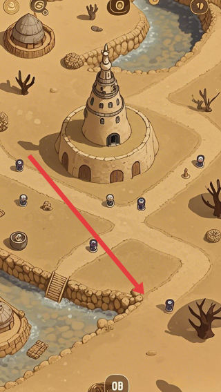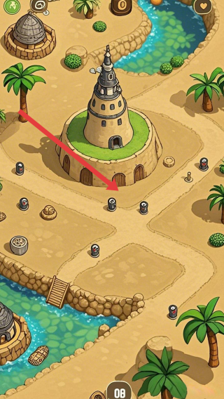 1、觀察沙漠地圖中塔樓周邊敵人路徑,規(guī)劃防御建筑布局,利用地形阻擋敵人進(jìn)攻,守護(hù)核心塔樓。