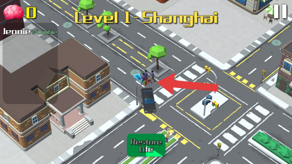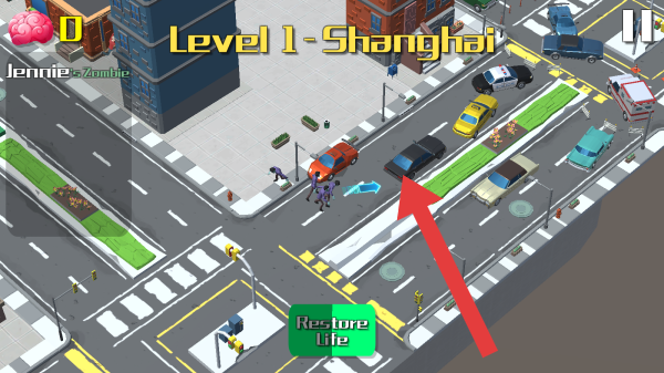 2、顯示了城市街道場景,有僵尸群體、車輛、建筑,還有“RestoreLife”功能按鈕,呈現(xiàn)了在上海地圖關(guān)卡進行僵尸對戰(zhàn)、生存冒險的玩法場景。
