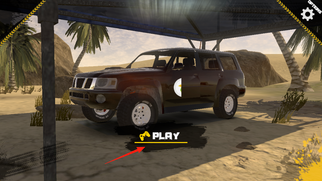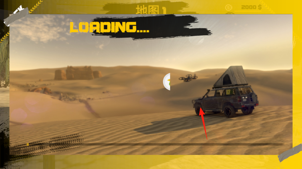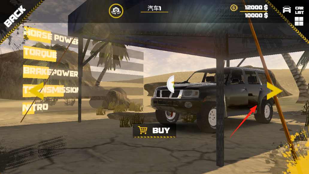 1、玩法流程點擊“PLAY”進(jìn)入游戲,可在車庫界面查看車輛屬性(馬力、扭矩等),花費金幣(12000$)購買越野車,進(jìn)入“地圖1”沙漠場景駕駛。