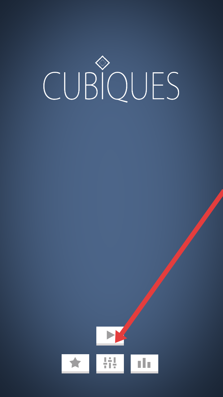 1、進(jìn)入立方迷宮游戲的主界面,點(diǎn)擊底部中間的播放按鈕,啟動(dòng)CUBIQUES的空間解謎冒險(xiǎn)。