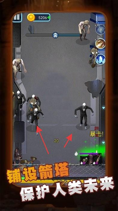 1、消耗金幣“鋪設(shè)箭塔”,在僵尸路徑部署防御,攻擊來(lái)襲僵尸,守護(hù)人類未來(lái)。
