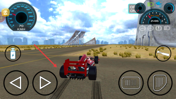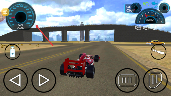 2、行駛中關(guān)注左側(cè)速度表,用虛擬按鍵控制方向與加速,保持高速行駛。