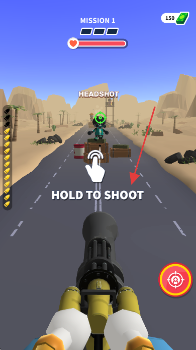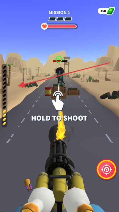 2、在MISSION1中,按住屏幕射擊,消滅道路前方的敵人。