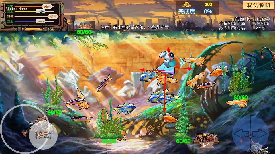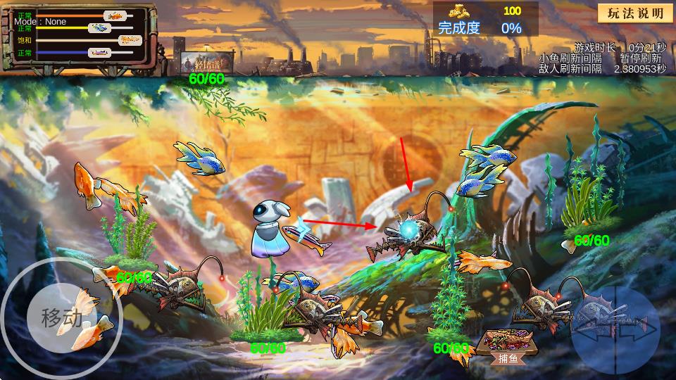 3、積累金幣提升角色能力,關(guān)注完成度、生命條,應(yīng)對(duì)小魚數(shù)量飽和、敵人刷新,生存并推進(jìn)關(guān)卡。