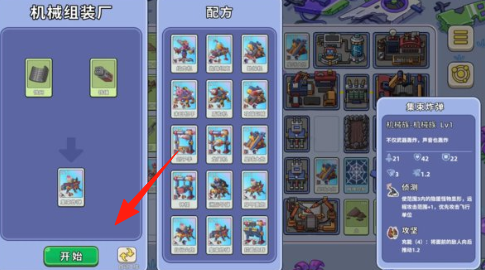 1、在機(jī)械組裝廠,選好【箭頭】指向的配方及材料,點(diǎn)擊“開始”,制作對(duì)應(yīng)機(jī)械。