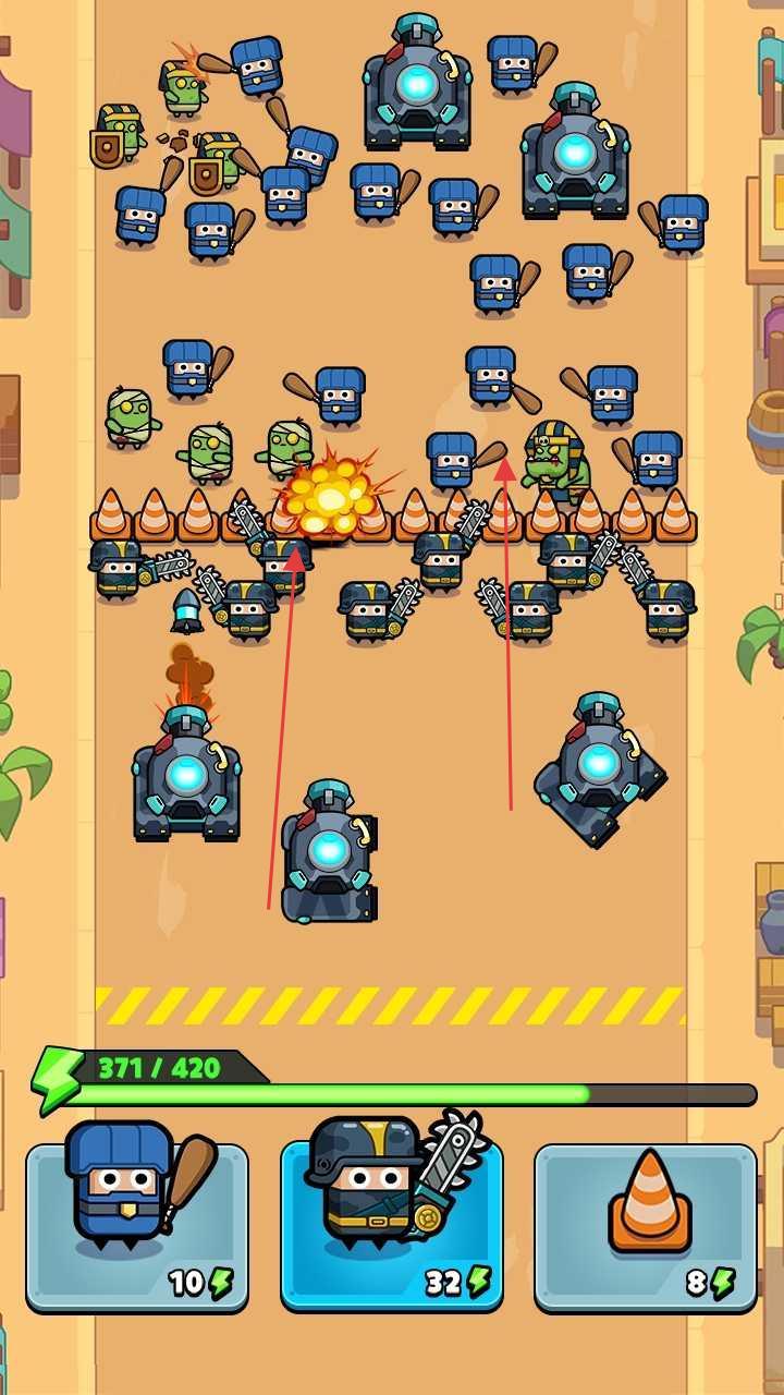 2、放置路障(8能量)、炸彈,延緩僵尸推進(jìn),利用兵種攻擊(棒球、電鋸)消滅敵人。