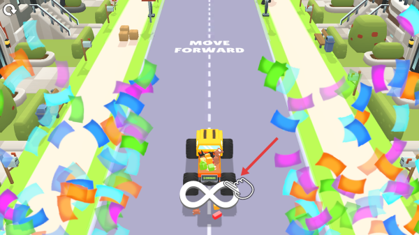 2、街道行駛時,按提示滑動或長按操作,讓卡車沿“MOVE FORWARD”路線前進,穿過彩帶路段,留意金幣、道具收集。