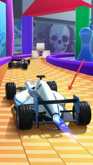 2、進(jìn)入彩色場(chǎng)景賽道,操控白藍(lán)賽車,避骷髏裝飾等障礙,利用直道加速,縮小與前車距離,找時(shí)機(jī)超車。