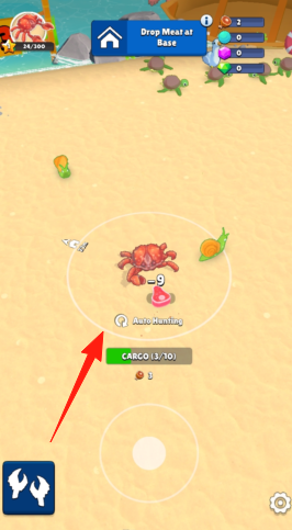 1、沙灘戰(zhàn)斗,點擊【箭頭】指向螃蟹,自動攻擊(Auto-Hunting),獲取資源。