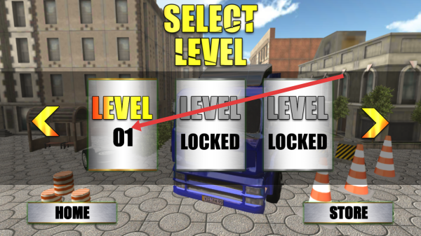 2、選關(guān)界面,通過點(diǎn)擊“LEVEL-01”(箭頭指向),進(jìn)入第一關(guān),開始卡車運(yùn)輸任務(wù)。