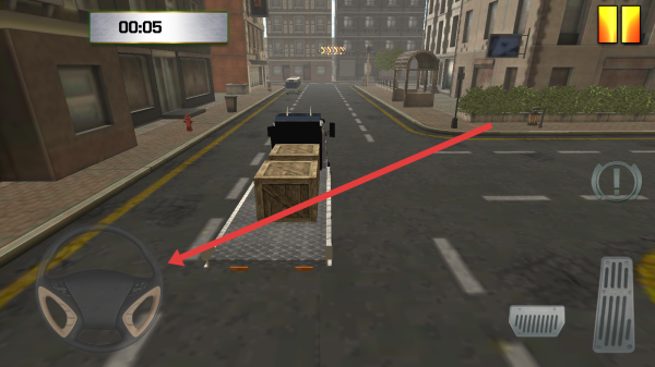 3、駕駛階段,通過左側(cè)虛擬方向盤(箭頭指向)控制卡車方向,在道路上行駛,完成運(yùn)輸挑戰(zhàn),注意時(shí)間限制(00:05)。