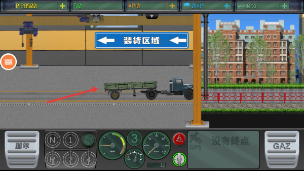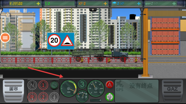 2、駕駛卡車出車庫,留意儀表盤數(shù)據(jù)和道路限速標志(如20),按交通規(guī)則控制車速、換擋。