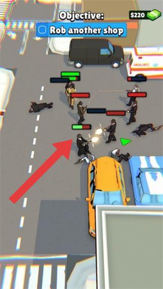2、畫面上方文字“Objective:Robanothershop”表明任務(wù)目標(biāo)是搶劫另一家商店,場景中有多個(gè)角色在街頭發(fā)生戰(zhàn)斗,還有車輛等元素。