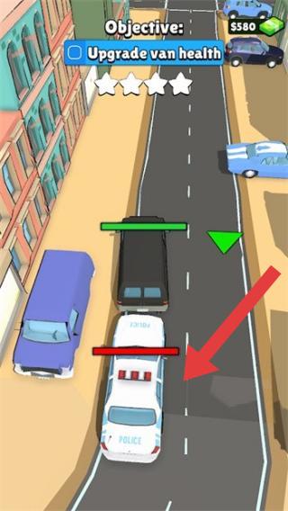3、畫面上方文字“Objective:Upgradevanhealth”顯示任務(wù)目標(biāo)是升級(jí)貨車生命值,場景中有街道、車輛,包括警車,還有星級(jí)評(píng)價(jià)標(biāo)識(shí)。