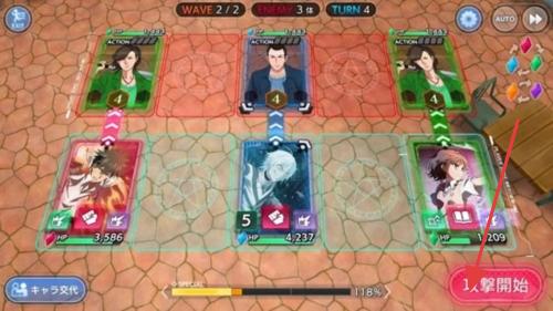 2、在戰(zhàn)斗布局界面,觀察敵我卡牌【HP】與技能,合理調(diào)整站位(如切換卡牌位置),利用屬性克制,點(diǎn)擊【攻撃開始】開啟回合戰(zhàn)斗。