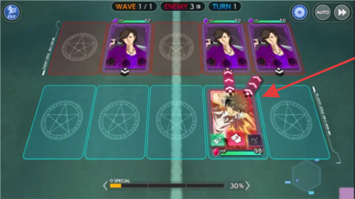 3、留意【W(wǎng)AVE】波數(shù)、【TURN】回合數(shù),優(yōu)先集火高威脅敵人,積累能量釋放“SPECIAL”,逐步清空敵方卡牌,贏取勝利。