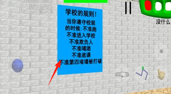 3、看到“學(xué)校的規(guī)則”告示牌,注意箭頭所指內(nèi)容,【嚴(yán)格遵守規(guī)則】,避免因違反規(guī)則(如打破第四堵墻等)而觸發(fā)不良事件,保障游戲順利進行。