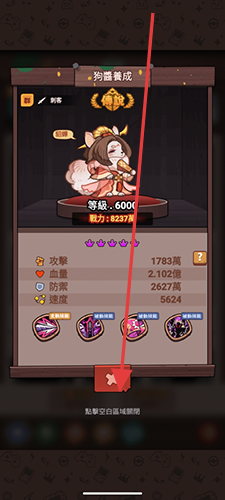 3、進(jìn)入角色養(yǎng)成(約醬),利用裝備、進(jìn)階道具提升等級(jí)(6000級(jí))與戰(zhàn)力(8277),搭配技能(攻擊、血量等屬性)。