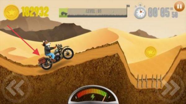 1、進入游戲,操控騎摩托的角色在沙漠地形(LEVEL01)行駛,借左右按鍵控平衡,過起伏地形,收集金幣。