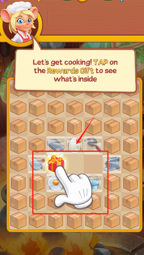 1、點擊紅框里手指指向的禮物盒,查看里面隱藏的獎勵;背景中堆滿的紙箱營造出熱鬧的氛圍,充滿探索感。