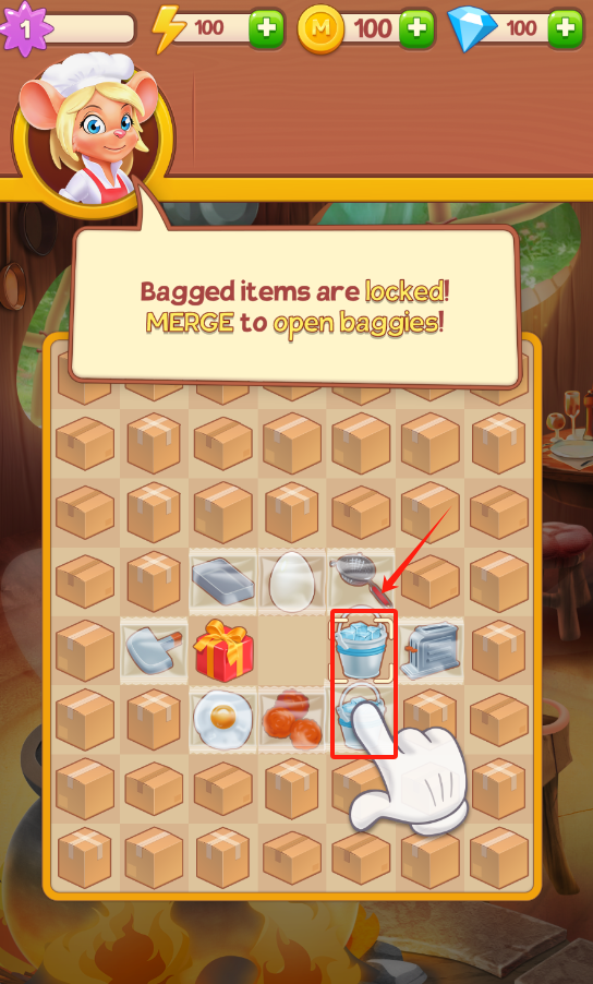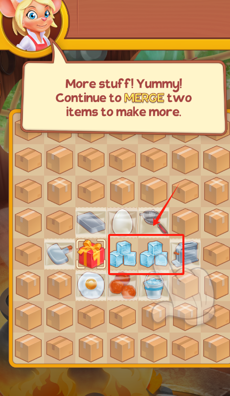2、拖動兩個冰塊或其他相同物品進行合并,就能生成新的東西;棋盤上的食材和工具擺放得較為雜亂,種類豐富,等待你去整理與合成。
