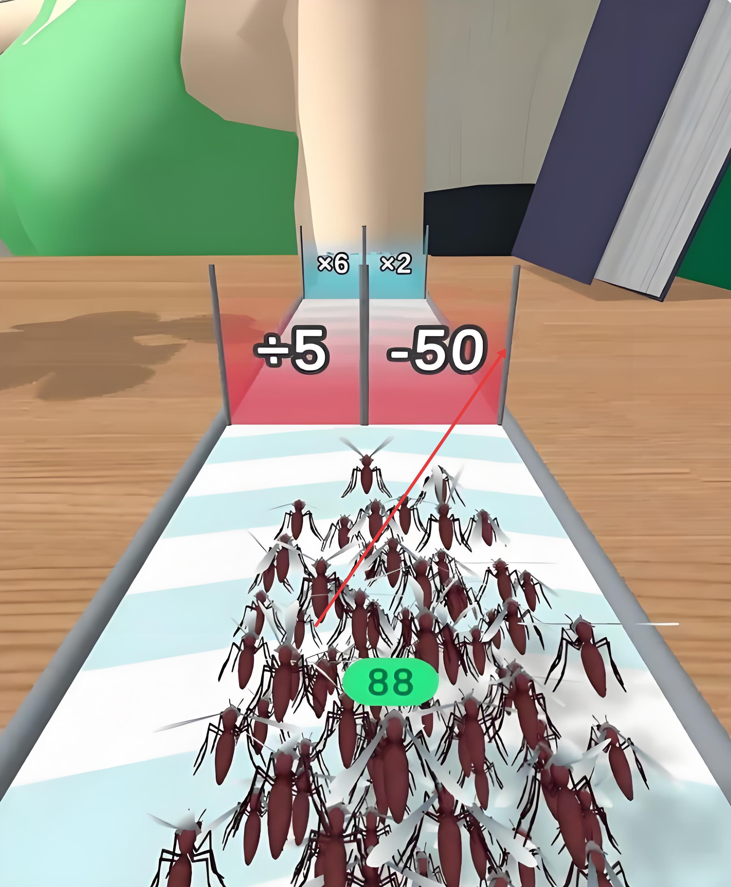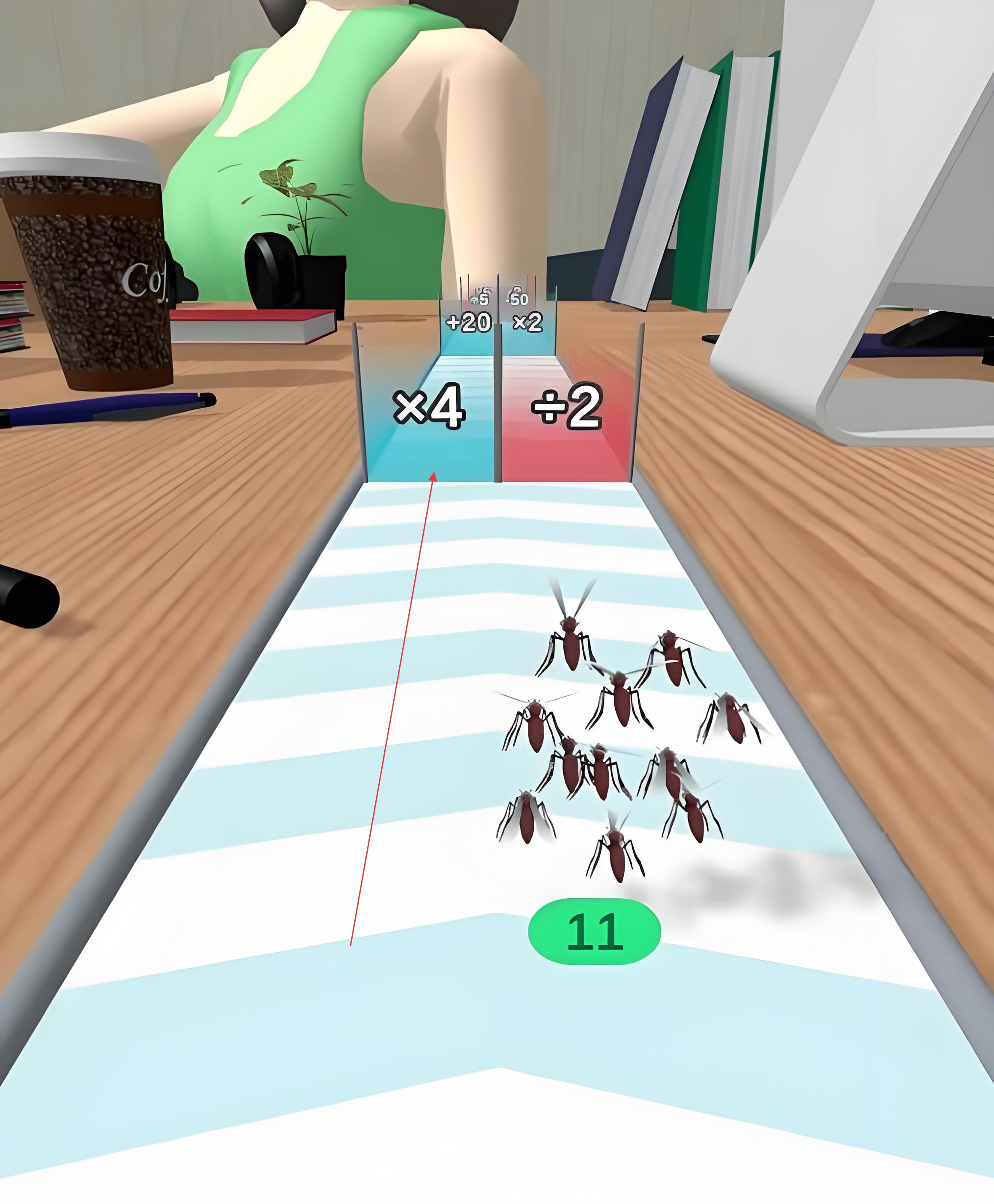 3、抵達關(guān)底前的殺蟲劑區(qū)域,需將蚊群拆分為多股小隊,分批穿越噴霧范圍,最終成功降落在人類肩膀的蚊群數(shù)量越多,獲得的獎勵越豐厚。