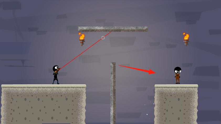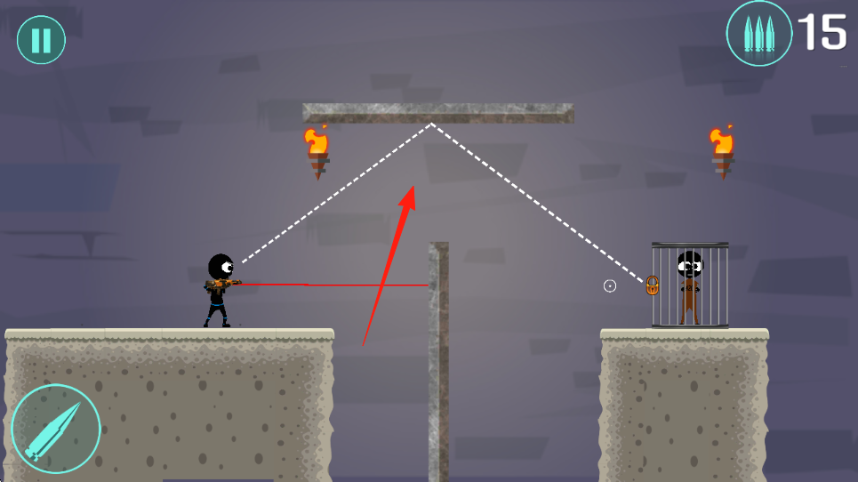 2、進(jìn)入關(guān)卡,觀察場景(如石塊、火把),調(diào)整射擊角度(按箭頭指引),利用物理反彈,射擊鑰匙,打開牢籠救人。