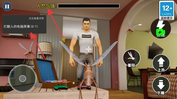1、扮演蚊子,界面顯示 “打翻轉(zhuǎn)的電腦屏幕(0/1)” 等任務(wù),用左側(cè)搖桿控制飛行方向,右側(cè) “著陸”“上升”“下降” 調(diào)整位置,靠近目標(biāo)(如電腦、桌上物品 )搞破壞。