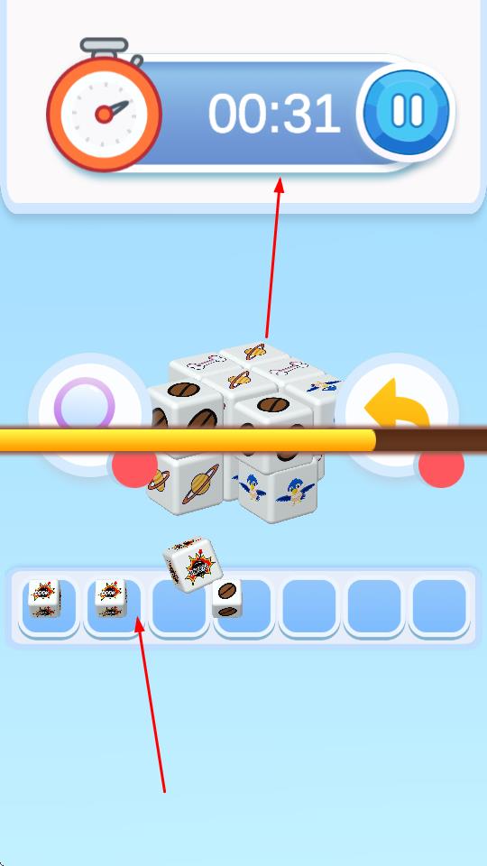 1、旋轉(zhuǎn)立方尋找匹配:滑動(dòng)屏幕旋轉(zhuǎn)3D立方體,仔細(xì)觀察每個(gè)立方塊上的圖案,尋找3個(gè)相同圖案的立方體,通過(guò)點(diǎn)擊與旋轉(zhuǎn)調(diào)整位置,讓相同圖案的立方體形成匹配組合。
