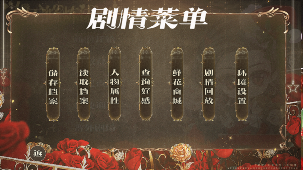 3、菜單頁(yè)可【儲(chǔ)存檔案】【讀取檔案】,查【人物屬性】【查詢好感】,逛【鮮花商城】,【劇情回放】重溫,調(diào)【環(huán)境設(shè)置】推進(jìn)游戲。