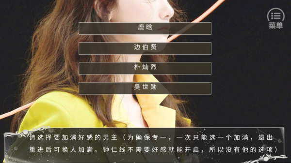 2、在好感全滿通道,選【鹿晗】【邊伯賢】【樸燦烈】【吳世勛】其一,為該男主加滿好感(一次選一個,退出重進可換)。