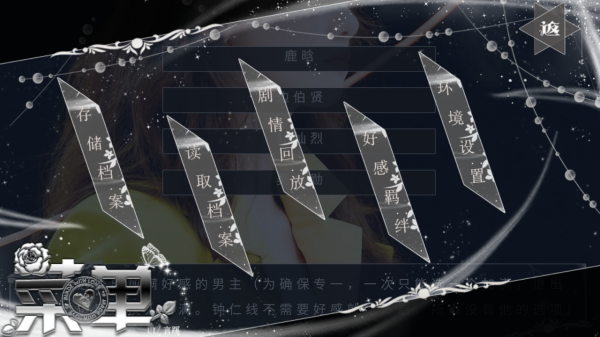 3、菜單頁可操作【存儲檔案】【讀取檔案】【劇情回放】【好感羈絆】【環(huán)境設(shè)置】,管理游戲進度與體驗 。