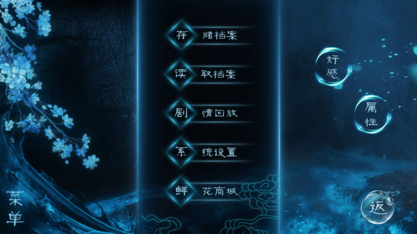 3、菜單頁可【存儲(chǔ)檔案】【讀取檔案】,【劇情回放】【系統(tǒng)設(shè)置】,查【好感】【屬性】,借功能推進(jìn)游戲進(jìn)程。