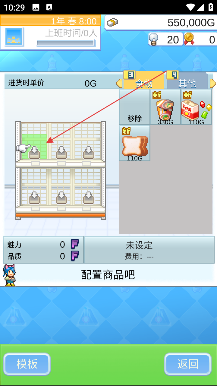2、進(jìn)入店鋪場(chǎng)景,根據(jù)提示點(diǎn)擊貨架,配置食物、其他類商品,提升貨架魅力與品質(zhì)。