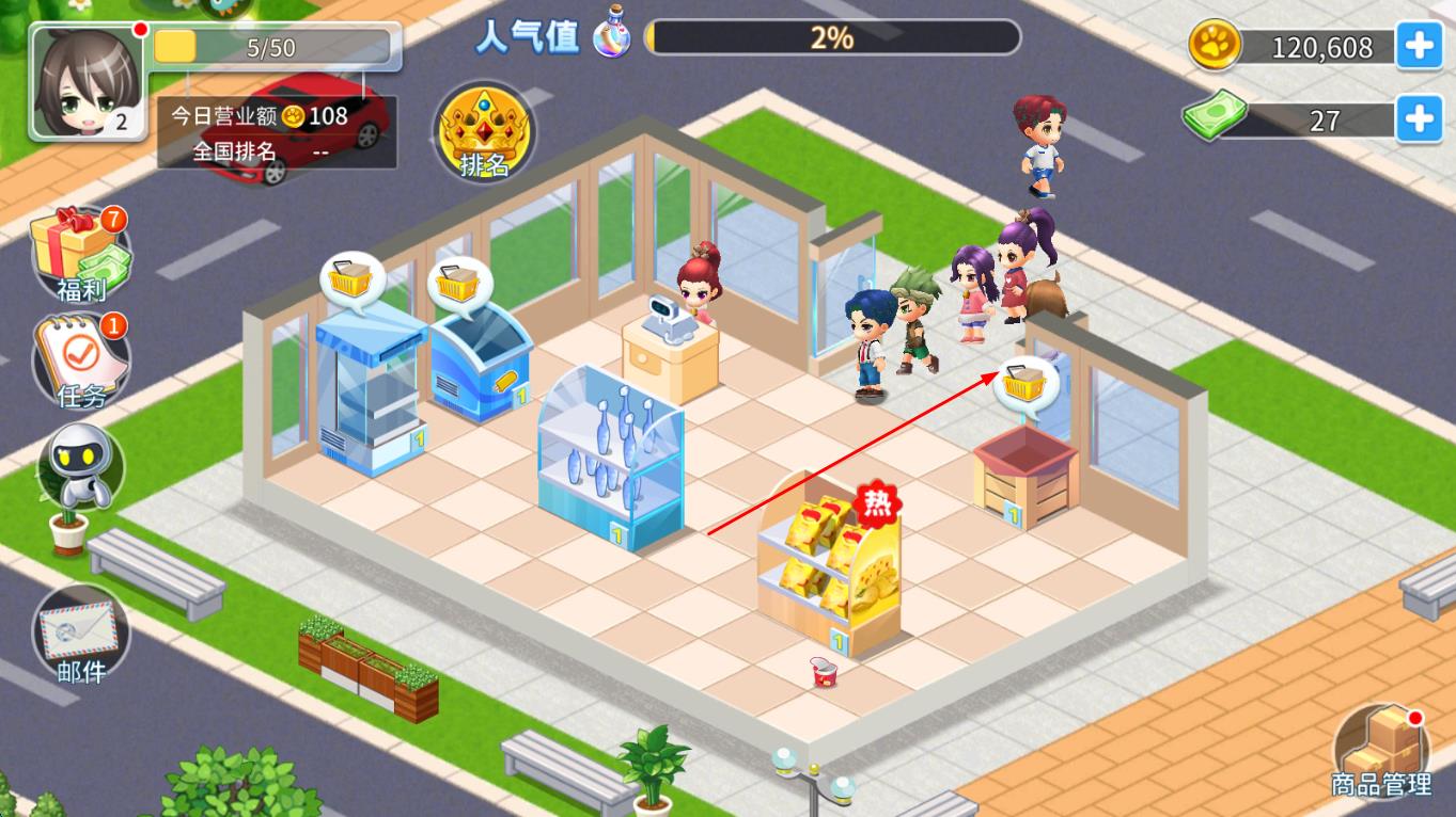 2、經(jīng)營過程中,時刻留意顧客需求,及時補(bǔ)貨,關(guān)注系統(tǒng)發(fā)布的主線任務(wù),像是限時促銷特定商品等,完成后獲取獎勵,用獎勵資金升級貨架,提升商品陳列魅力值。