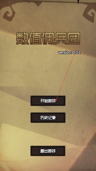 1、進(jìn)入游戲界面,點(diǎn)擊【開(kāi)始游戲】按鈕,正式開(kāi)啟《數(shù)值傭兵團(tuán)》冒險(xiǎn),創(chuàng)建或延續(xù)你的傭兵團(tuán)旅程。