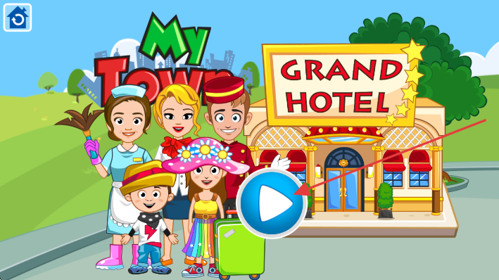 1、進入【My Town Grand Hotel】游戲,點擊藍色播放鍵,開啟酒店經(jīng)營冒險之旅。