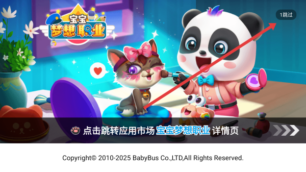 1、在《寶寶夢想職業(yè)》啟動(dòng)頁,點(diǎn)擊【1跳過】,略過開場動(dòng)畫,快速進(jìn)入游戲主界面。