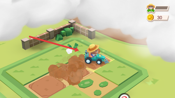 3、進(jìn)入游戲場景后,操控開著藍(lán)色拖拉機(jī)的小熊,按箭頭指引,在農(nóng)場里進(jìn)行耕地等操作,開始農(nóng)場勞作。