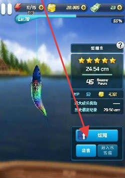 2、釣到紅鯉魚(yú)等魚(yú)類(lèi)后,查看長(zhǎng)度、星級(jí)等屬性,可選擇【炫耀】分享成果,或【放入水族館】留存,積攢資源。