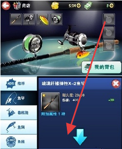 3、進(jìn)入【我的背包】,用金幣升級(jí)“破璃纖維釣竿-X新手”等漁具,提升耐久、釣力,挑戰(zhàn)高階漁場(chǎng),釣稀有魚(yú)。