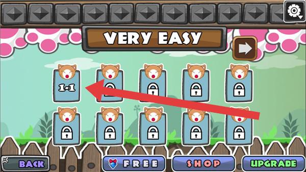 1、點擊【TAP-TO-START】,進入《Cat-War》,選擇“VERY-EASY”難度的“1-1”關(guān)卡,開啟貓咪戰(zhàn)斗。
