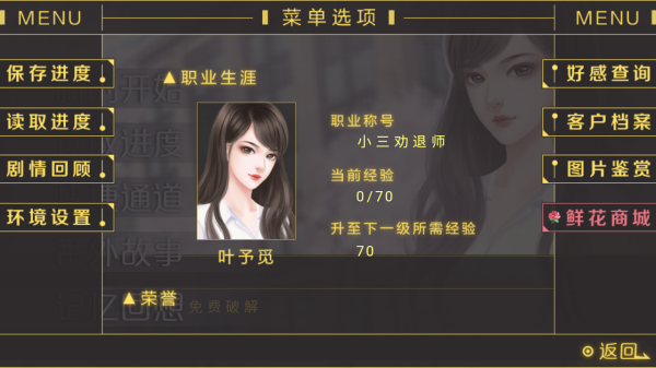 3、菜單頁可【保存進度】【讀取進度】【劇情回顧】,調(diào)【環(huán)境設(shè)置】,查【好感查詢】【客戶檔案】,逛【鮮花商城】,借功能推進游戲進程,關(guān)注角色“葉予覓”職業(yè)生涯成長。