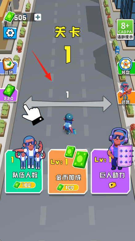 1、在關(guān)卡1界面,按需選擇“隊(duì)伍人數(shù)”“金幣加成”等增益(如點(diǎn)隊(duì)伍人數(shù)提升戰(zhàn)力),點(diǎn)擊箭頭指向區(qū)域,進(jìn)入戰(zhàn)斗。