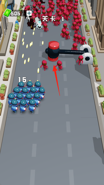 2、操控角色沿道路(箭頭指向)前行,遭遇紅色怪物群,自動射擊,推進(jìn)關(guān)卡。