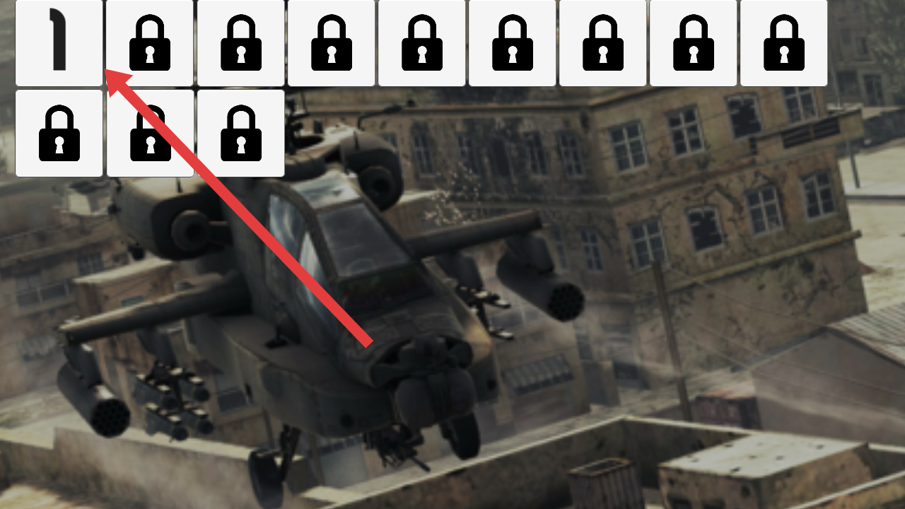1、在關卡選擇界面,點擊左上角標有【1】的解鎖關卡,進入直升機作戰(zhàn)相關任務,開啟首關挑戰(zhàn)。