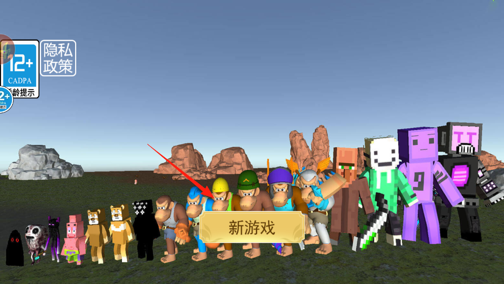 1、顯示“新游戲”按鈕,角色陣容包含猴子、人形等多樣像素角色,左上角有12+CADPA適齡提示。