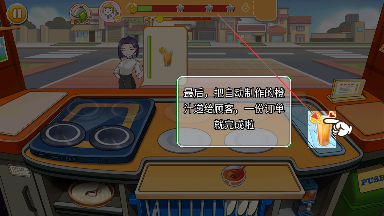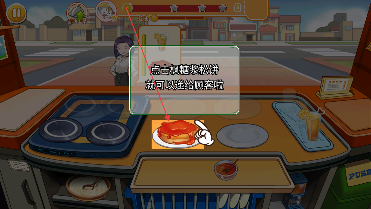 2、通過點(diǎn)擊操作,將制作好的食物(如點(diǎn)擊楓糖漿松餅、橙汁)遞送給顧客,完成訂單達(dá)成連擊可獲額外獎(jiǎng)勵(lì)。