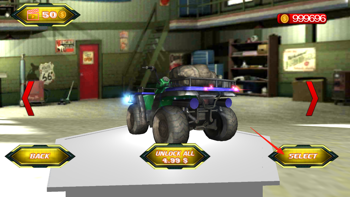 2、進(jìn)入車輛選擇頁(yè),瀏覽不同ATV車型,點(diǎn)擊“SELECT”選定當(dāng)前車輛,借車輛定制機(jī)制,確認(rèn)座駕后,為越野競(jìng)速匹配專屬ATV,體驗(yàn)個(gè)性化駕駛前的車型敲定。